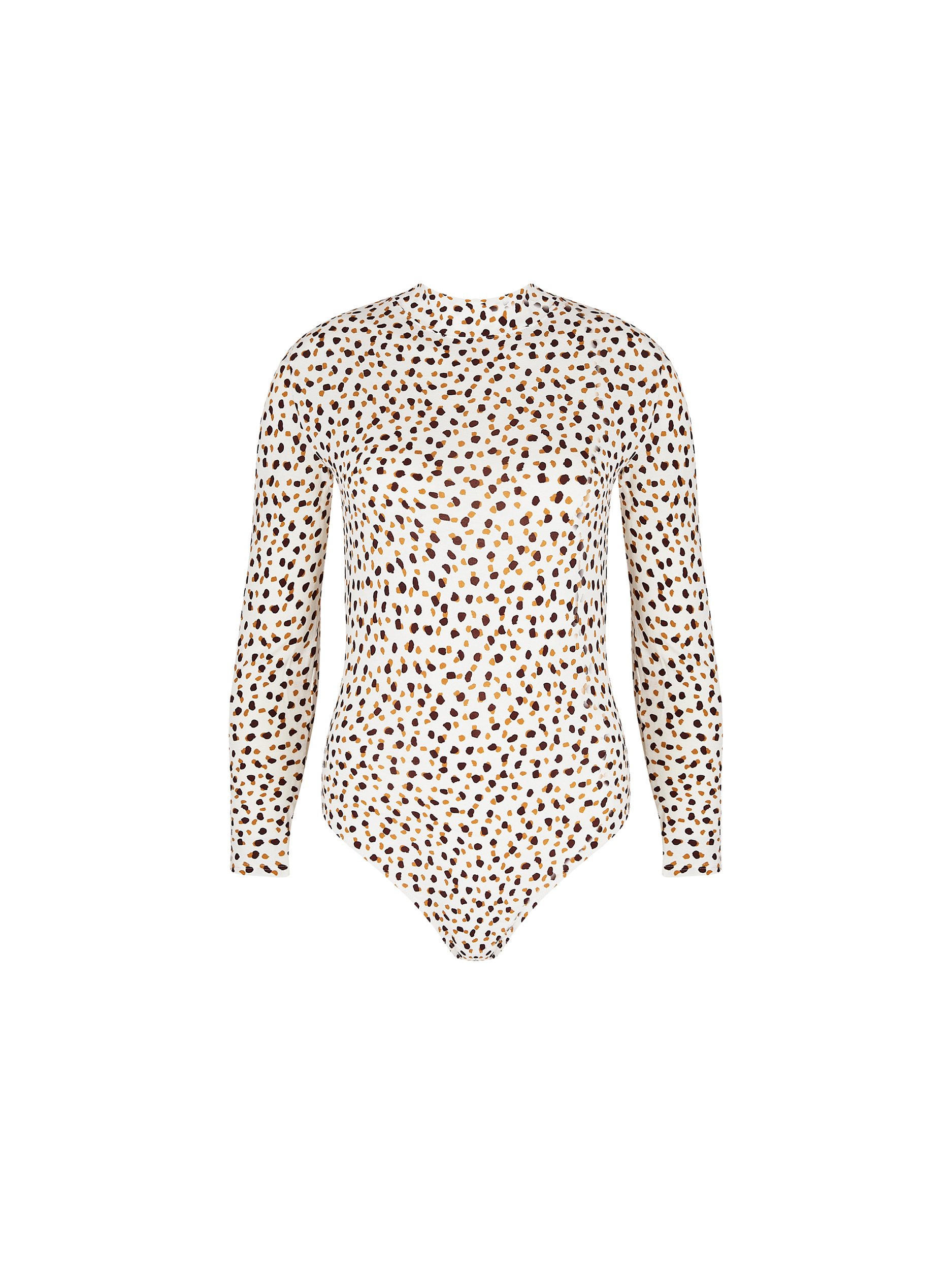 Tel un juste-au-corps de danseuse. Possibilité de le porter en dessus-dessous. Body tout en maille imprimée, à manches longues et col cheminé. Disponible de la taille 1 à 4.