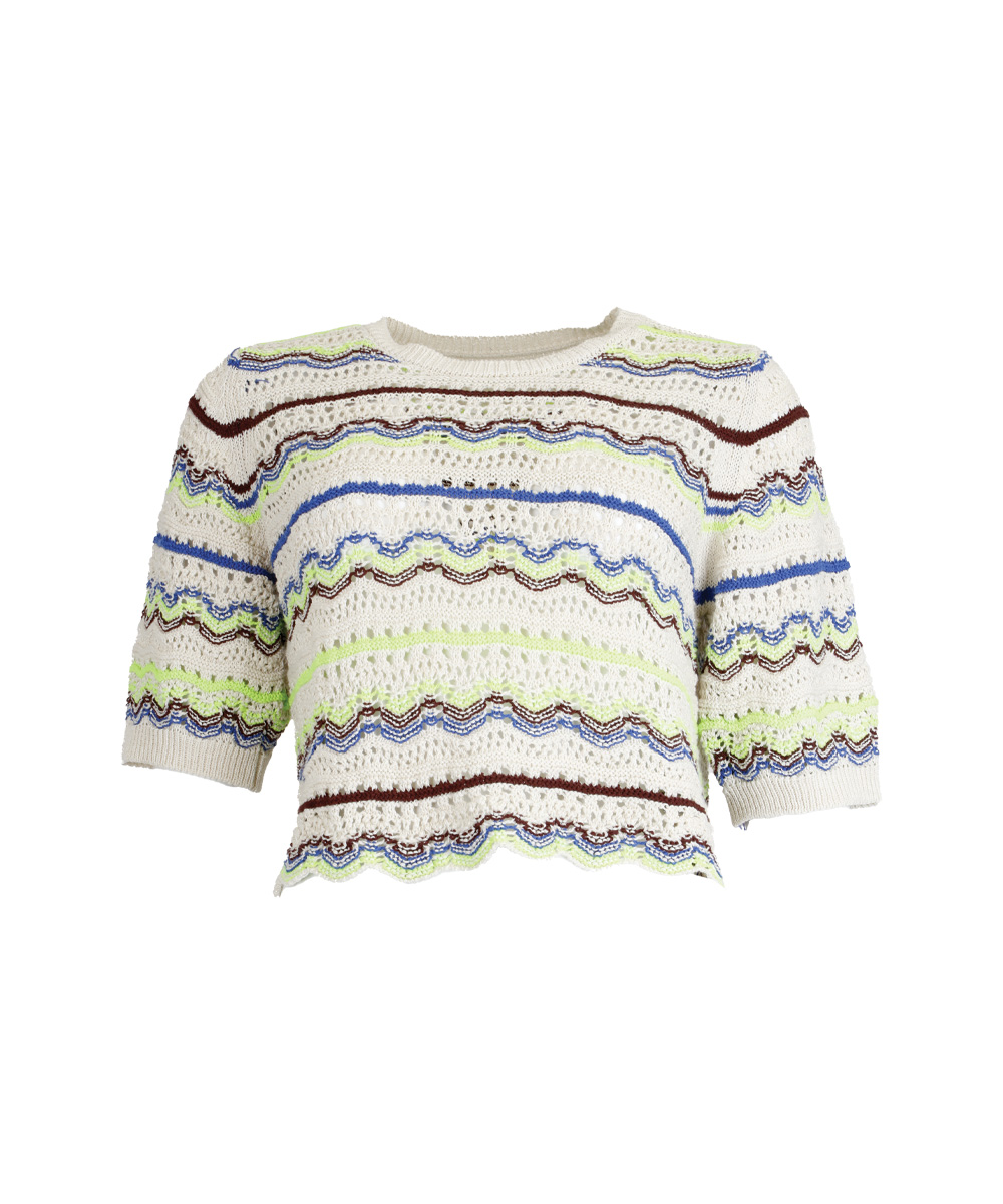 Pull Maille Ajourée, manches Coudes. Matière 50 % Coton 50 % Acrylique. Disponible de la taille 1 à 5.
