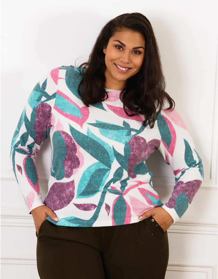 pull Léger blanc à motifs – Coupe droite – Encolure ronde – Manches longues – Boutons sur la couture épaule – Maille douce. Composition : 82% viscose, 13% polyester, 5% elasthane. Disponible de la taille 1 à 5.